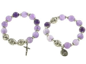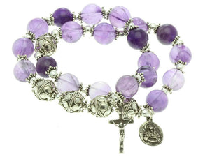 Handmade Sterling Silver 7 Sorrows / Traditional Rosary Elastic bracelet. This is a two bracelets set, a 7 Sorrows elastic Bracelet and a Trinity elastic Bracelet With Sterling Silver 7/8" of an inch by 7/16" of an inch Crucifix and ½" inch by 3/8" of an inch of Our Lady of Sorrows Medal, It was made with Sterling Silver Beads, S. Silver spacers and 10 millimeters round shape Amethyst Semi-precious stone Beads.