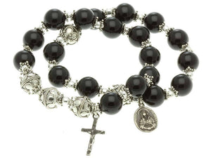 Handmade Sterling Silver 7 Sorrows / Traditional Rosary Elastic bracelet. This is a two bracelets set, a 7 Sorrows elastic Bracelet and a Trinity elastic Bracelet With Sterling Silver 7/8" of an inch by 7/16" of an inch Crucifix and ½" inch by 3/8" of an inch of Our Lady of Sorrows Medal, It was made with Sterling Silver Beads, S. Silver spacers and 10 millimeters round shape Black Onyx Semi-precious stone Beads.