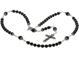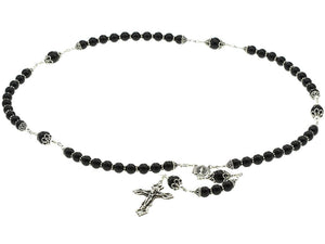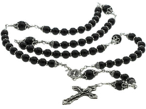 Handmade Sterling Silver Traditional Rosary. Made with Sterling Silver heavy gauge wire, Sterling Silver beads, a sterling silver Miracle Medal and a Sterling Silver Crucifix and Semi-Precious 8 millimeter Round Black Onyx Stone Beads.