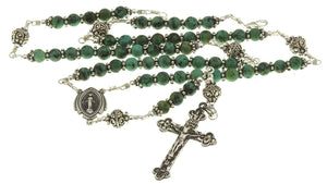 Handmade Sterling Silver Traditional Rosary. Made with Sterling Silver heavy gauge wire, Sterling Silver beads, a sterling silver Miracle Medal and a Sterling Silver Crucifix and Semi-Precious 6 millimeter Round South African Turquoise Stone Beads. The size of the Crucifix is 2" inches by 1" and a 1/4 inch and the Miracle Medal is 3/4" of an inch by 9/16" of an inch.