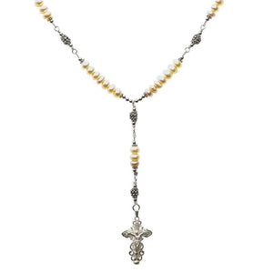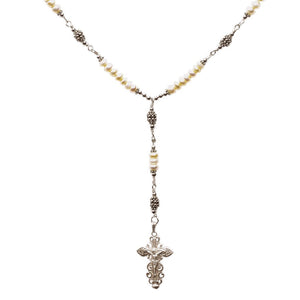 Handmade Sterling Silver 7 Sorrows Rosary. Made with Sterling Silver 1" 1/4 inches x 7/8" of an inch Medal Crucifix, Sterling Silver Beads and Roundel shape Freshwater - cultured Pearl 6mm. Approximate Length: 17" 3/4 inch plus 2" 1/2 inch extension chain.