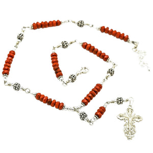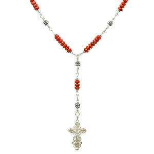 Handmade Sterling Silver 7 Sorrows Rosary. Made with Sterling Silver 1" 1/4 inches x 7/8" of an inch Medal Crucifix, Sterling Silver Beads and Roundel shape Faceted Red Coral 6mm.