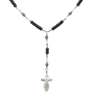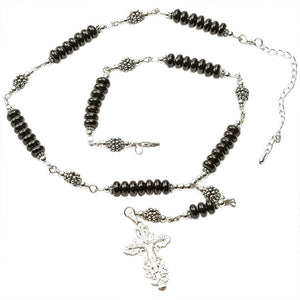Handmade Sterling Silver 7 Sorrows Rosary. Made with Sterling Silver 1" 1/4 inches x 7/8" of an inch Medal Crucifix, Sterling Silver Beads and Roundel shape Black Onyx 6mm. Approximate Length: 17" 3/4 inch plus 2" 1/2 inch extension chain.
