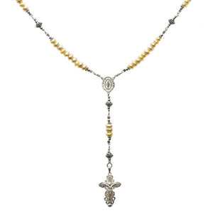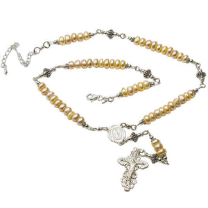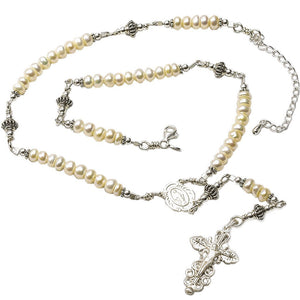 Handmade Sterling Silver Traditional Rosary. Made with sterling silver heavy gauge wire (very resistant), sterling silver beads, a sterling silver Miracle Medal and a sterling silver Crucifix, it also has Freshwater - Cultured Pearls 6 millimeter Button shape (53 pearls).