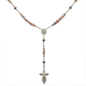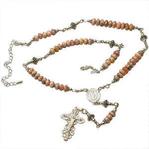 Handmade Sterling Silver Traditional Rosary. Made with sterling silver heavy gauge wire (very resistant), sterling silver beads, a sterling silver Miracle Medal and a sterling silver Crucifix, and with Rhodochrosite 6 millimeter Button shape Gems beads (53 Semi-precious stone Beads).