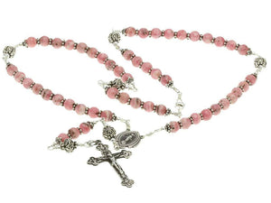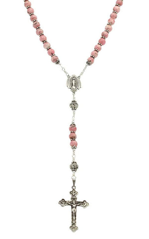 Handmade Sterling Silver Traditional Rosary. Made with Sterling Silver heavy gauge wire, Sterling Silver beads, sterling silver Miracle Medal, Sterling Silver Crucifix and Semi-Precious 6 millimiter Round Shape Rhodochrosite Stone Beads. The size of the Crucifix is 2" inches by 1" 1/4 inch and the Miracle Medal is 3/4" on an inch by 9/16" of an inch.