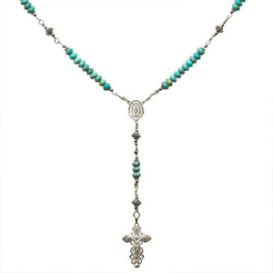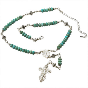 Handmade Sterling Silver Traditional Rosary is made with sterling silver heavy gauge wire (very resistant), sterling silver beads, a sterling silver Miracle Medal and a sterling silver Crucifix and Turquoise 6 millimeter Faceted Button shape Gems beads (53 Semi-precious stone Beads).